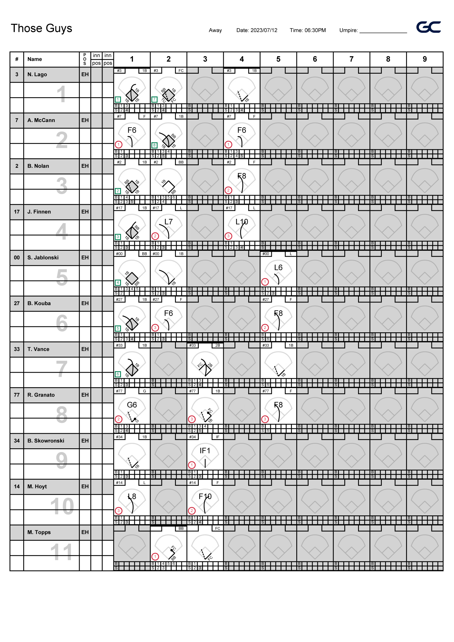 | 2B | Bryan Kouba | 3 | 1 | 1 | 2 | 0 | 0 | 0 | 0 | 0 | 0 |