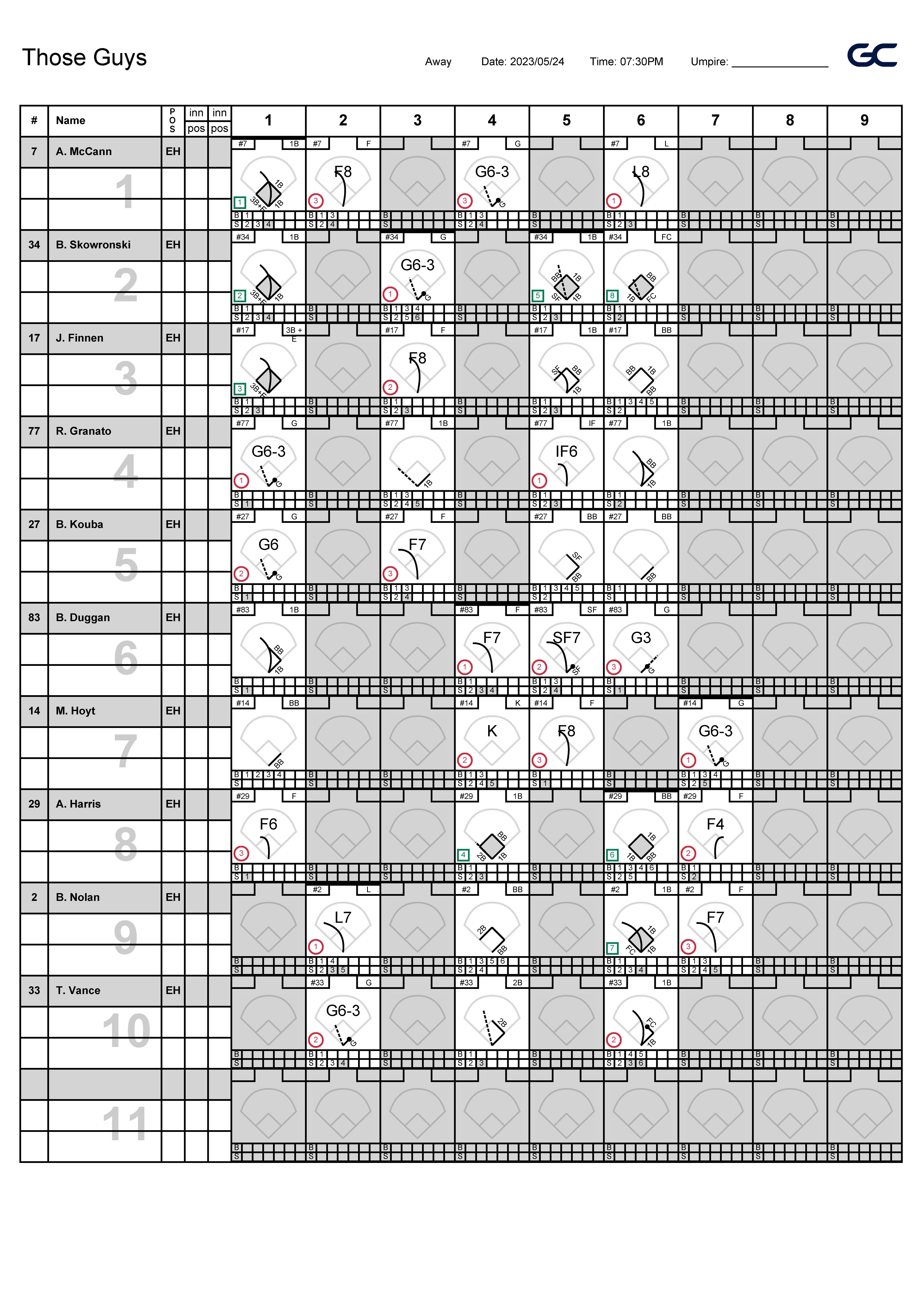 | 1B | Mike Hoyt | 3 | 0 | 0 | 0 | 0 | 0 | 0 | 0 | 1 | 1 |