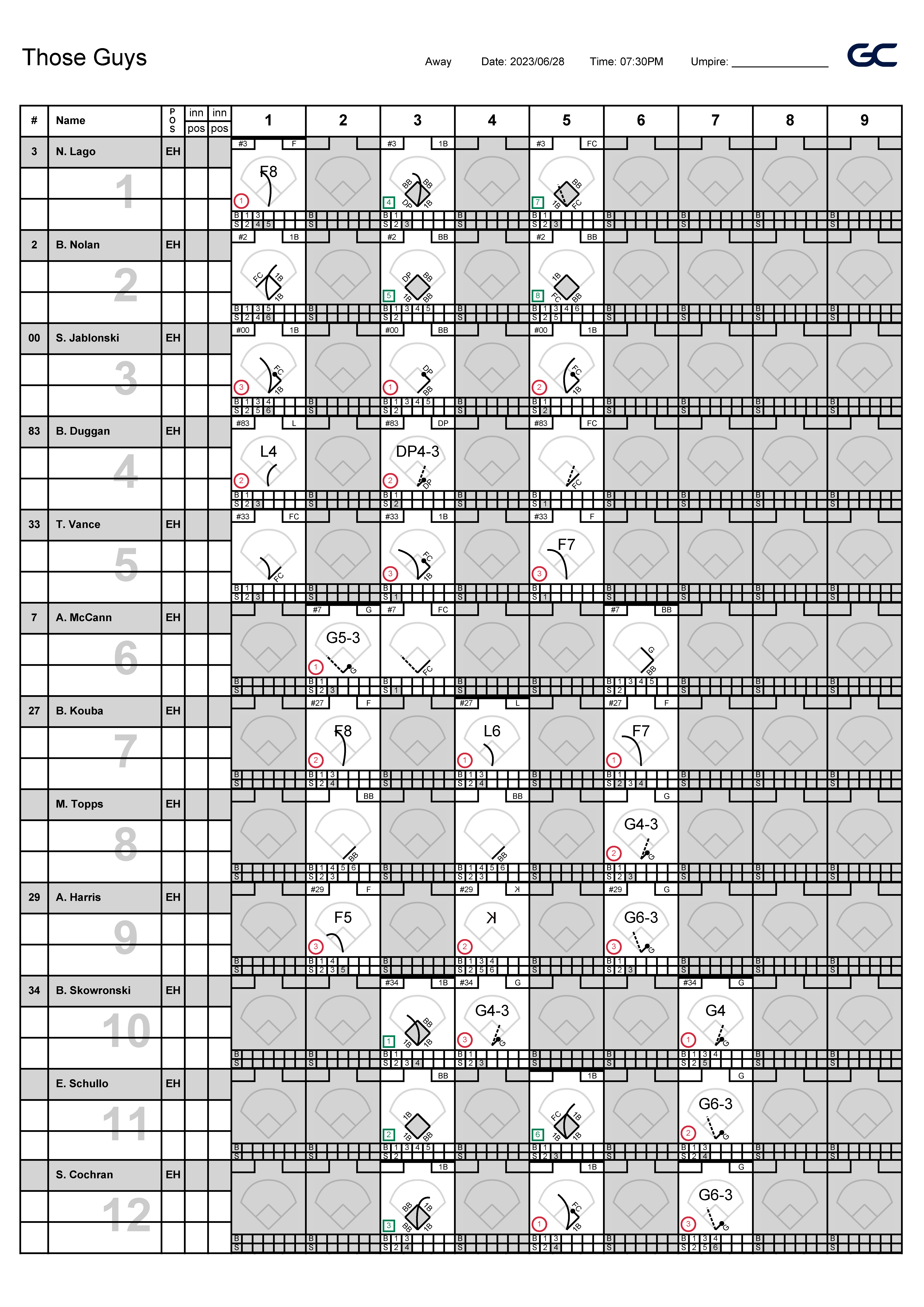 | 1B | Scott Jablonski | 2 | 0 | 2 | 3 | 0 | 0 | 0 | 0 | 1 | 0 |